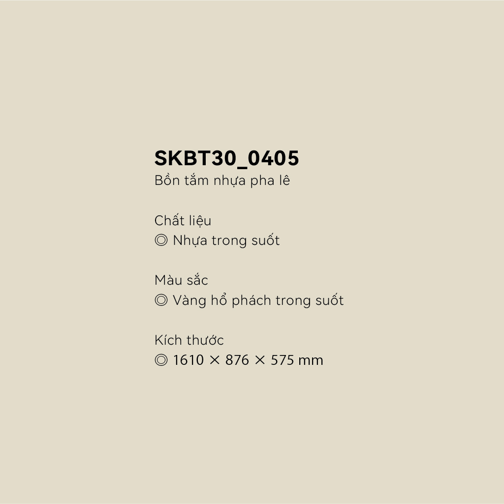 Được chế tạo từ nhựa acrylic cao cấp, bồn tắm sở hữu bề mặt sáng mịn, liền mạch và có độ hoàn thiện cao. Lớp vật liệu này không chỉ mang lại vẻ ngoài tinh tế mà còn giúp sản phẩm luôn giữ được màu sắc tươi sáng theo thời gian, hạn chế ố vàng và trầy xước. Đồng thời, acrylic có đặc tính nhẹ hơn so với nhiều vật liệu khác, giúp việc vận chuyển và lắp đặt trở nên linh hoạt hơn, đặc biệt phù hợp với các công trình cần tối ưu kết cấu.