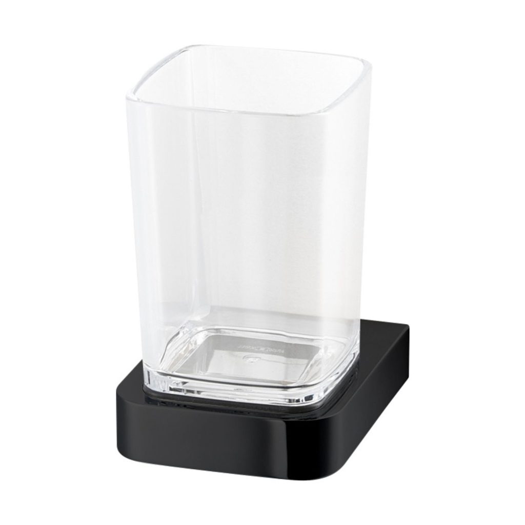 Cốc đánh răng bằng nhựa màu trong suốt, có giá đỡ bằng kẽm mạ màu đen, loại KH-705B-4, kích thước 70*102*89mm, nhãn hiệu: Klarhaus, hàng mới 100%