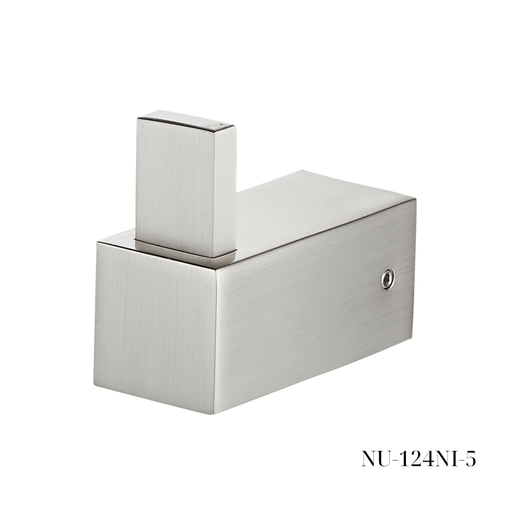 Thiết kế của móc NU-124NI-5 hoàn toàn theo phong cách tối giản và hình học. Phần đế là một khối hộp chữ nhật, trong khi móc treo nhô lên là một khối hình chữ nhật đứng sắc nét, tạo nên sự liền mạch và mạnh mẽ. Thiết kế này giúp giữ khăn hoặc áo choàng tắm chắc chắn và mang lại vẻ ngoài đẳng cấp.